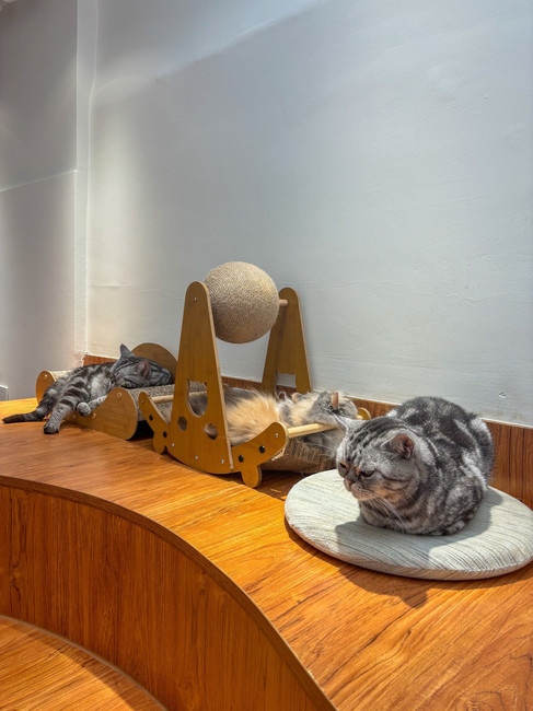 Inside, fat, fluffy cats lounge lazily all over every surface. It's a cat lover's dream. The cats are calm and there are plenty of helpful instructions on how to treat the furry friends from the kind staff. And the coffee is good too. All food orders are also kept protected from sneaky paws by protectors.